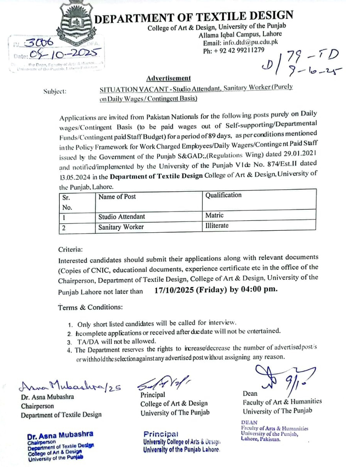 Job Type: SITUATION VACANT - Studio Attendant, Sanitary Worker (Purely on Daily Wages/ Contingent Basis) No. of Posts: Department: Department of Textile Design