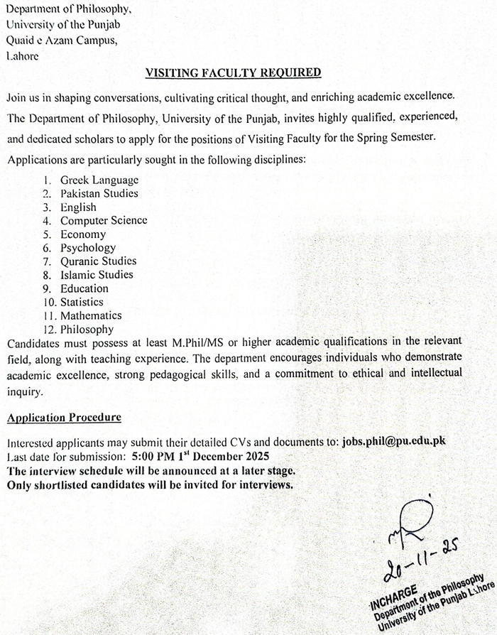 Careers Visiting Faculty Required (Department of Philosophy) Job Type: Visiting Faculty Required (Department of Philosophy)No. of Posts: Department: Department of Philosophy Requirement Criteria Closing Date 01-12-2025 Contact Back to Careers