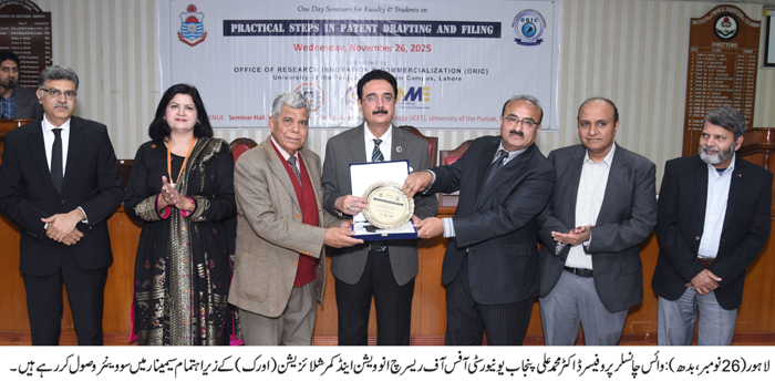 LAHORE: (Wednesday, November 26, 2025): Punjab University Office of Research Innovation and Commercialization (ORIC) organized a one-day seminar on “Practical Steps in Patent Drafting and Filing” at seminar hall of the Institute of Chemical Engineering and Technology. On this occasion, PU VC Prof Dr Muhammad Ali, Director ORIC Engr. Prof Dr Aqil Inam, renowned IP Attorney & Consultant Engr. Saad Nasrullah, President of PIMME Prof Dr Saleem Shuja, Deputy Directors ORIC Prof Dr Ghazala Yasmeen Butt, Syed Amer Hussain, faculty members and students were present. In his address, PU VC Prof Dr Muhammad Ali encouraged and appreciated the activities of the ORIC, PU. He also encouraged the faculty to learn the practical steps of Patent drafting and filing. He said that this seminar will help to boost university ranking. He also pointed out the need of era to give attention to the students to excel as students learn 30 percent from classes and 70 percent from outside the class, therefore, make the students flexible to fit in all environments. He emphasized the significance of applied research and patenting new technologies and expressed his pleasure towards the seminar. Dr Aqil welcomed the distinguished guests and participants and shed light on the contribution and role of ORIC in the promotion of research culture in the university and commercialization of the projects/technologies. Engr. Saad Nasrullah also delivered a comprehensive lecture on the topic. ![]() Tweet Follow @pu_lhr_official |