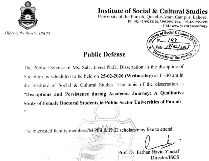 Ph.D. Public Defense and Viva Voce Examination of Ms. Saba Javed